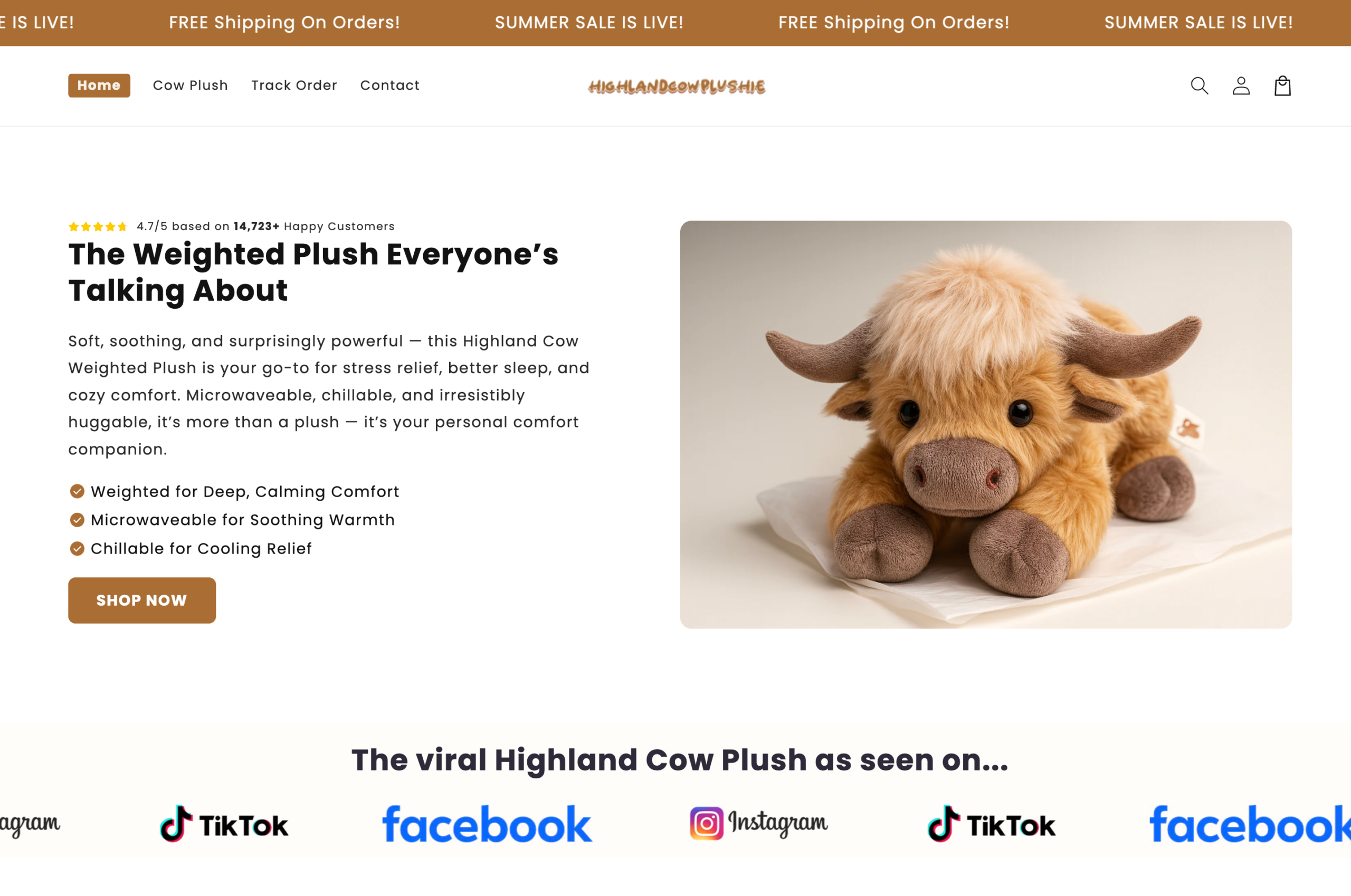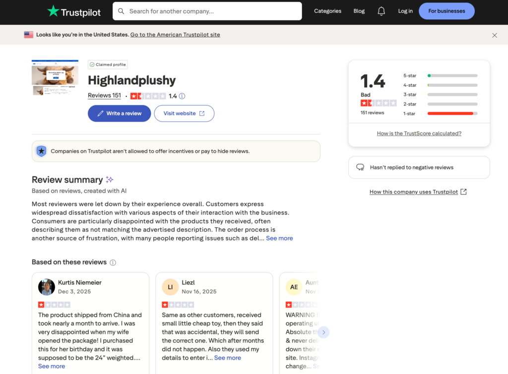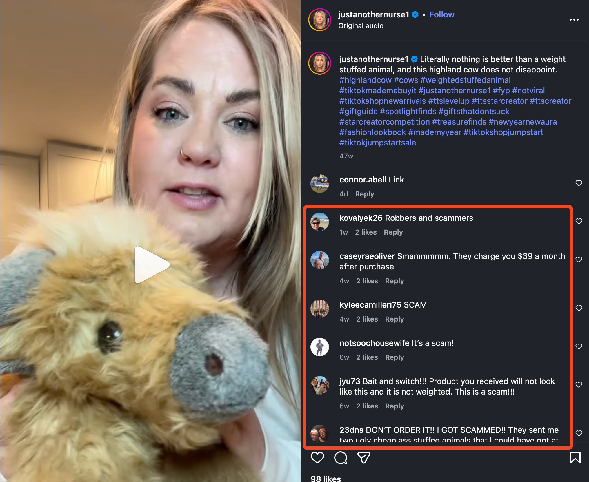 After some digging, I discovered that a highland cow scam company (along with some bottom feeder scammers) had completely taken over the product category. The scam is so prevalent that people are blaming legitimate content creators and stuffed animal companies after they get scammed.