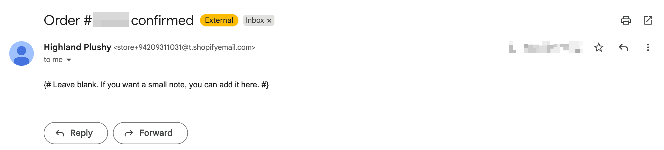 Yes, that is a blank confirmation email. They didn’t even bother to update the default Shopify message.