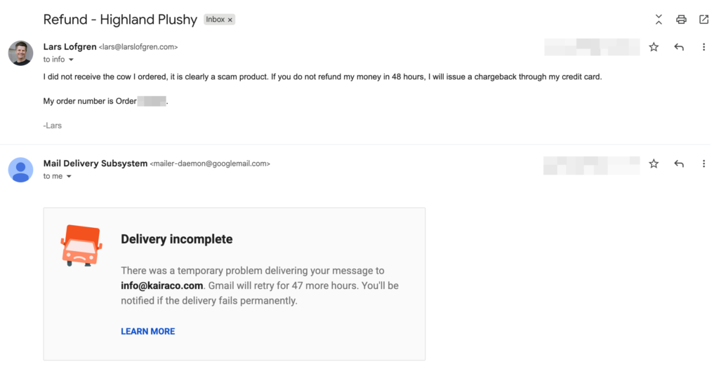 Now now, let’s not get too hasty. MAYBE it’s an honest mistake. (there’s no fucking chance it’s a mistake but let’s try doing the right thing). So I reached out and asked for a refund, using the email address that was listed in their refund policy: