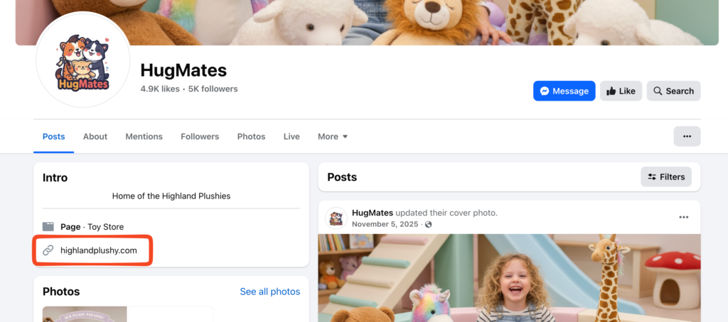 The website that scammed me was highlandplushy.com. Guess what’s listed as the domain in the HugMates Facebook profile: