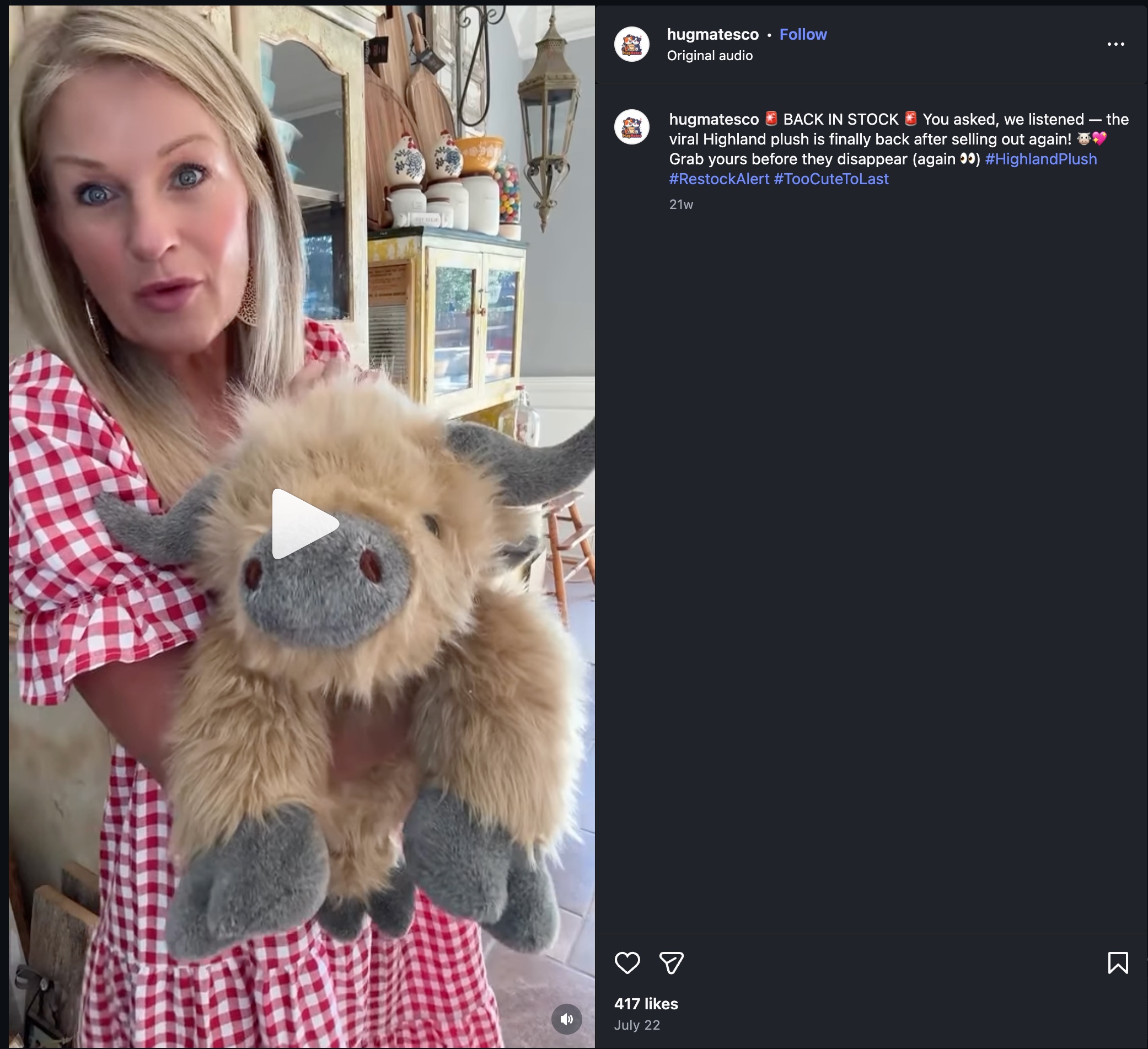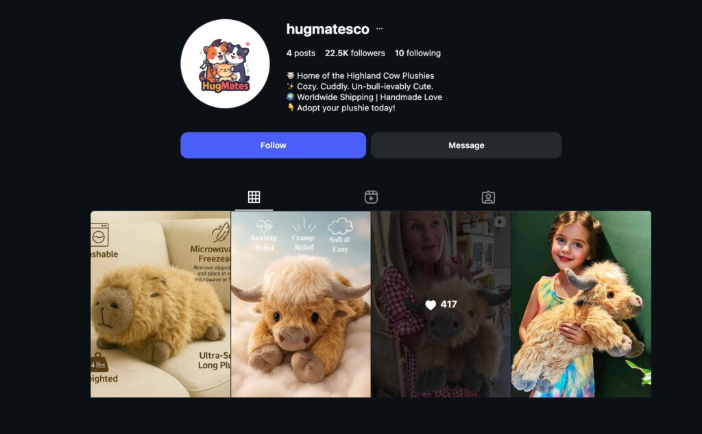 For the vast majority of people, the first time they encounter the fabled highland cow stuffy will be from a paid ad on Instagram or TikTok. Take this suspiciously inactive company profile: